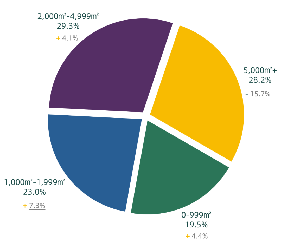 從2023 年第二季度寫字樓成交面積來看,本季度 2,000-4,999 平方米的成交面積占比最大,為 29.3% ;超過 5,000 平方米的成交面積占比為 28.2% ,環(huán)比上季度降低 15.7 個(gè)百分點(diǎn),其他各類成交面積占比均有一定程度上升。