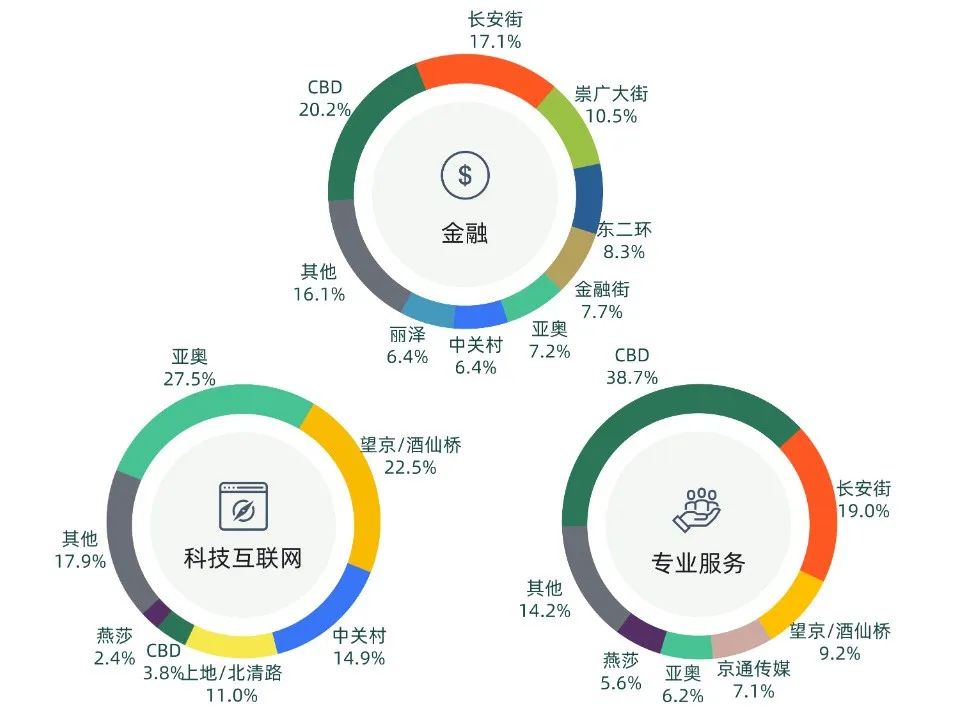 2023年第二季度科技互聯(lián)網(wǎng)行業(yè)在亞奧及望京 / 酒仙橋商圈成交面積占比顯著,超過全市的五成,中關(guān)村、上地 / 北清路等商圈也有該類企業(yè)落位。