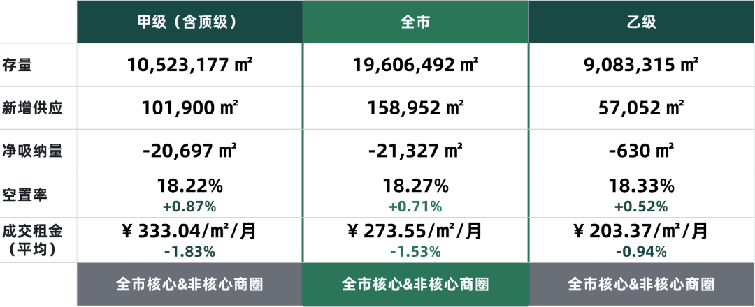 其中甲級(jí)(含頂級(jí))寫字樓成交租金環(huán)比下降1.83個(gè)百分點(diǎn),為每平方米每月 333.04 元;乙級(jí)寫字樓成交租金環(huán)比下降 0.94 個(gè)百分點(diǎn),錄得每平方米每月 203.37 元。