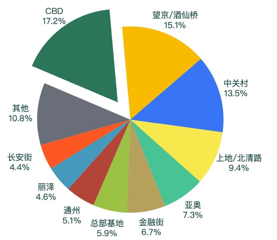 2024年第二季度,CBD、望京/酒仙橋、中關村、上地/北清路商圈是本季度成交的熱點區域,占比約為全市成交面積的50%。CBD商圈成交面積占比17.2%,望京/酒仙橋商圈在本季度成交面積占比為15.1%,中關村商圈成交面積占比為13.5%,上地/北清路商圈成交面積占比為9.4%。