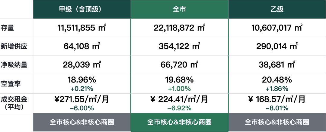 從2024年第二季度空置率來看,同比去年同期全市整體空置率上升1.0個百分點,但本季度市場展現出了更高的活躍度;預計短期內空置率將受到新入市項目及樓宇面積釋放的推動而繼續上升,這將激發更多租戶在市場中尋找降本增效的契機,推動市場成交的增長。