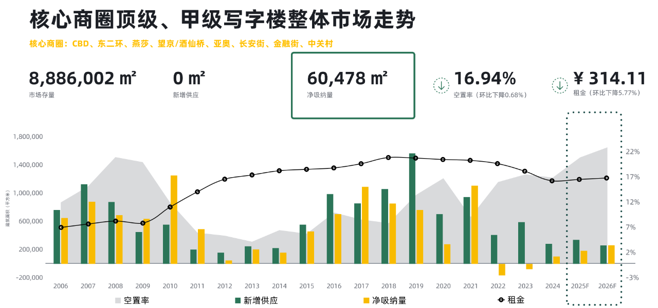 從城市更新項目來看,2024年全年預計還將有2個城市更新項目入市,為亞奧、中關村商圈的寫字樓市場帶來超過10萬平方米的新增供應量。
