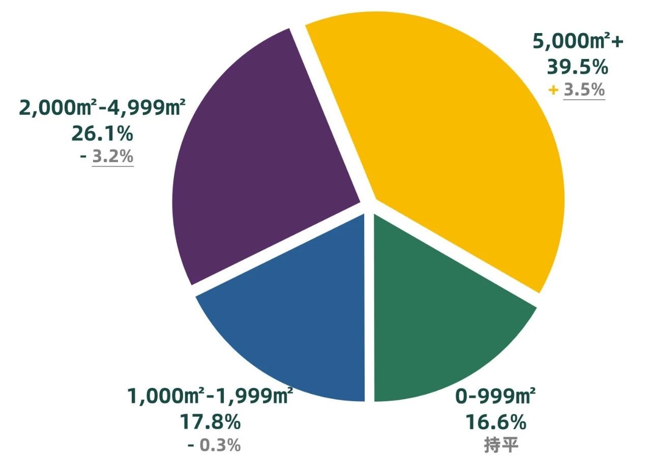 從本季度寫字樓成交面積來看,本季度超過5,000平方米的成交面積占比最大,為39.5%,環比上升3.5個百分點;2,000-4,999平方米的成交面積占比為26.1%,環比降低3.2個百分點;1,000-1,999平方米的成交面積占比為17.8%,環比降低0.3個百分點;0-999平方米的成交面積占比為16.6%,環比無變化。